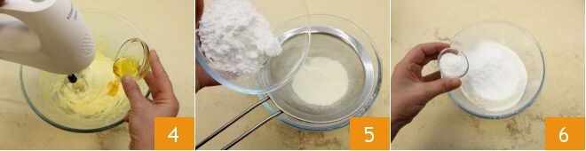 Quando o ovo estiver incorporado na massa, adicione o mel 4, continuando a bater para misturar bem todos os ingredientes. Em uma tigela separada, peneire a farinha junto com o amido 5 e o fermento em pó 6.
