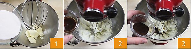 Para preparar os biscoitos grão de café, comece preparando o café. Enquanto isso, coloque a manteiga na tigela de uma batedeira (ou, se não tiver uma batedeira, em uma tigela normal para trabalhar com uma batedeira elétrica). Adicione o açúcar 1 e bata até obter uma mistura homogênea e cremosa. Sempre batendo, adicione o café líquido 2 e o em pó 3.