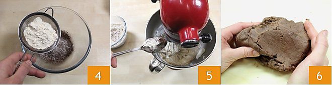 Em uma tigela separada, peneire a farinha e o cacau em pó 4. Em seguida, coloque a pá na batedeira e adicione aos poucos a farinha misturada com cacau em pó 5. Amasse até obter uma massa compacta, que você transferirá para uma superfície de trabalho 6.