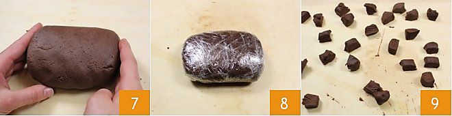 Trabalhe-a com as mãos, formando um bloco 7 firme e homogêneo e depois embrulhe-o em filme plástico 8. Deixe solidificar na geladeira por pelo menos 2 horas. Após duas horas, divida a massa em pedaços de 15 g cada, usando uma balança 9.