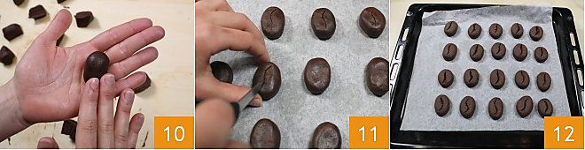 Manipule cada pedaço, formando uma bolinha de forma oval e ligeiramente achatada 10, exatamente como um grão de café. Cubra uma assadeira com papel manteiga, coloque os grãos e faça um corte em “S” com uma faquinha na superfície 11. Coloque a bandeja na geladeira por 30 minutos para deixar os grãos firmes, para que mantenham a forma ao serem assados. Agora asse em forno estático já quente a 170° por 20 minutos (se usar forno ventilado, asse a 150° por 10 minutos). Após esse tempo, retire do forno e deixe esfriar em uma grade 12. Agora é só saborear seus biscoitos grão de café acompanhando-os com uma boa xícara de café!