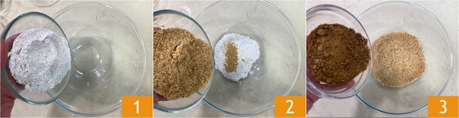 Para preparar os biscoitos integrais com frutas secas, coloque em uma tigela grande a farinha integral 1, a farinha de avelã 2 e o açúcar muscovado 3.