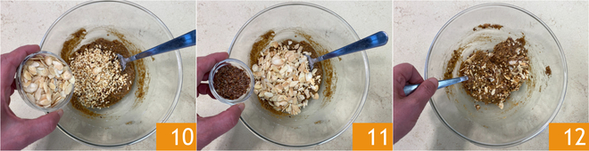 Por fim, adicione as amêndoas em lâminas 10 e as sementes de linhaça 11. Misture até obter uma massa homogênea 12.