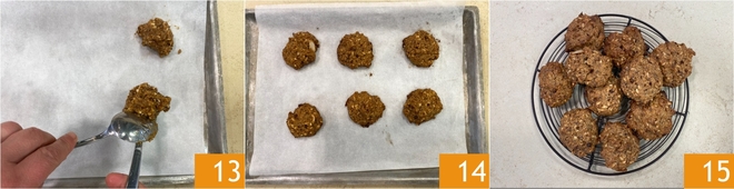 Modele os biscoitos pegando cerca de 35 g de massa por vez e deixando-os escorregar com a ajuda de 2 colheres sobre uma assadeira forrada com papel-manteiga 13; com essas quantidades você obterá cerca de 10 biscoitos. Asse em forno estático preaquecido a 180°, depois retire do forno e deixe esfriar 14. Seus biscoitos integrais com frutas secas estão prontos para serem saboreados 15!