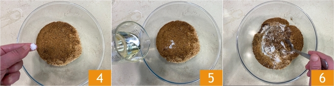 Adicione uma pitada de sal 4, depois despeje gradualmente o óleo 5 mexendo com uma colher 6.