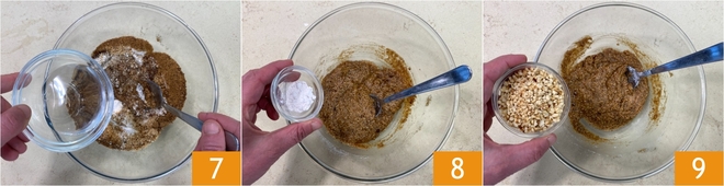 Faça o mesmo com a água 7. Incorpore também o fermento para bolos 8, depois junte os pedaços de avelã 9.