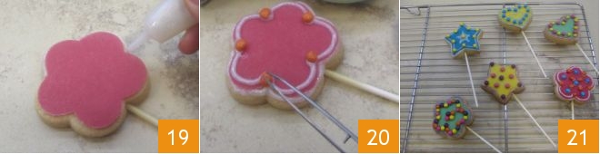 Nesse ponto, você pode decorá-los como preferir, por exemplo, com decorações em gel para finalizar as bordas dos biscoitos 19; depois enriqueça-os com confeitos de chocolate 20 a serem colocados sempre com a cola comestível para um resultado de grande efeito. Seus biscoitos pirulito estão prontos para serem saboreados 21.