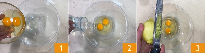 Per preparare i biscotti senza burro, versate in una ciotola le uova 1, l'olio di semi 2 e la scorza grattugiata del limone 3.