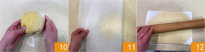 Lavorate con le mani giusto il tempo di ottenere un impasto omogeneo e formate un panetto 10. Sistemate l'impasto al centro di un foglio di carta forno abbastanza lungo e ripiegate le estremità verso il centro, in modo da coprire bene la frolla 11. Utilizzate un mattarello per appiattire leggermente la frolla, poi sigillate la carta forno formando un pacchetto 12. Trasferite in frigorifero per almeno 30 minuti.