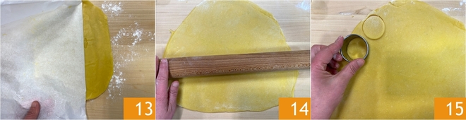 Quando la frolla all'olio avrà riposato, trasferitela sul piano da lavoro ed eliminate la carta forno 13; poi con laiuto di un po di farina e un mattarello stendetela allo spessore di circa 5 mm 14. Formate i biscotti con un coppapasta del diametro di 5 cm 15.