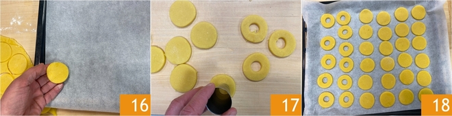Trasferite circa la metà dei biscotti su una teglia rivestita con carta forno 16. Ora prendete un altro coppapasta più piccolo del diametro di 2 cm e create un foro all'interno dell'altra metà dei biscotti 17, poi trasferite anche questi sulla teglia 18. Impastate gli scarti e proseguite in questo modo sino a terminare l'impasto. Otterrete circa 30 biscotti interi e 30 biscotti forati.