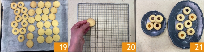 Cuocete in forno statico preriscaldato a 1750 per circa 20 minuti. Quando saranno dorati, sfornate i biscotti 19 e lasciateli raffreddare, meglio se su una gratella 20. Servite i biscotti senza burro semplici o farciti con confettura o Nutella 21!