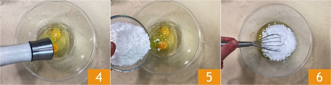 Unite anche un pizzico di sale 4 e lo zucchero a velo 5. Mescolate bene con una frusta 6.