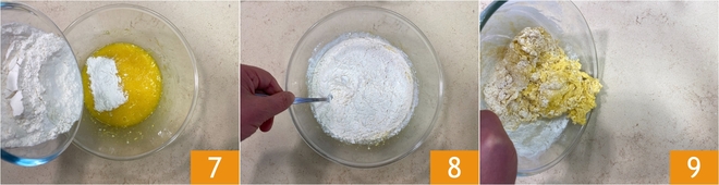 Aggiungete poi la farina 7 e mescolate con una forchetta 8. Quando la farina sarà assorbita, trasferite il composto su un piano da lavoro 9.
