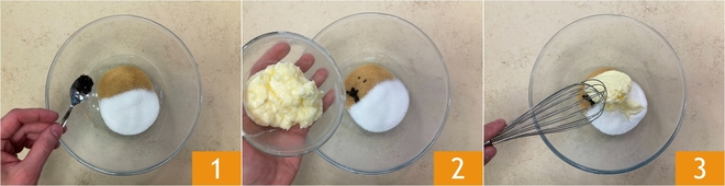 Para preparar os cookies, coloque em uma tigela o açúcar refinado e o açúcar mascavo, depois adicione as sementes da vagem de baunilha 1 e a manteiga amolecida 2. Misture vigorosamente com um batedor para incorporar tudo 3.
