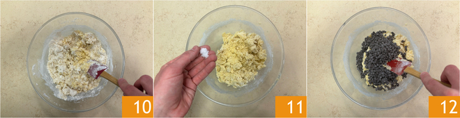 Misture com uma espátula 10 e, uma vez obtida uma massa homogênea, adicione uma pitada de sal 11 e as gotas de chocolate meio amargo 12.