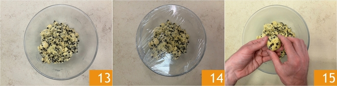 Mexa uma última vez para incorporá-las uniformemente 13, depois cubra com filme plástico 14 e deixe endurecer na geladeira por 30 minutos. Pegue a mistura e forme esferas de cerca de 50 g cada, sem trabalhar ou compactar muito 15. Se preferir, você pode usar um porcionador de sorvete.