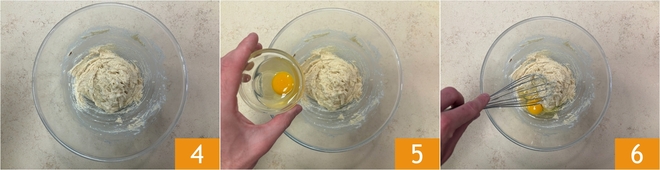 Depois de misturar a massa, adicione o ovo inteiro 5 e continue mexendo com o batedor 6.