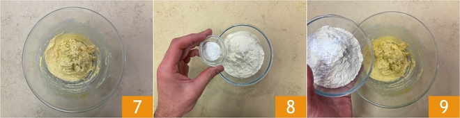 Você deve obter uma massa homogênea e sem grumos 7. À parte, misture a farinha com o fermento em pó 8. Despeje os ingredientes secos na massa 9.