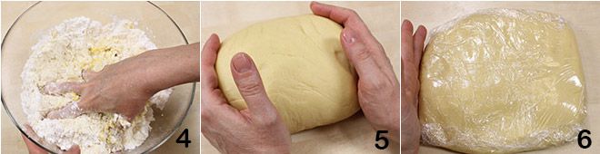 Na tigela, comece a misturar todos os ingredientes com as mãos, depois continue amassando na bancada 4: você deve obter uma massa compacta e elástica. Assim que a massa de torta estiver pronta, forme uma bola 5, cubra-a bem com filme plástico e coloque na geladeira para descansar por cerca de meia hora 6.