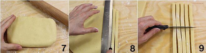 Passado o tempo necessário, retire a massa da geladeira e comece a formar os biscoitos fósforo: para obter uma forma de paralelepípedo o mais precisa possível, é necessário que a massa esteja bem fria, por isso recomendamos dividi-la em duas partes e começar a trabalhar com uma delas, colocando a outra na geladeira. Estenda a massa com um rolo até obter uma espessura de cerca de 1 cm 7 e então corte tiras de cerca de 20 cm de comprimento e 1 cm de largura 8 e corte-as ao meio para obter bastões de cerca de 10 cm de comprimento 9.