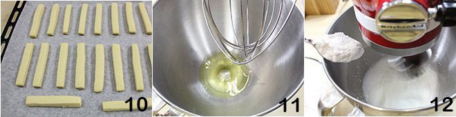 Repita a operação com a massa que você guardou na geladeira. Coloque os bastões obtidos em uma assadeira forrada com papel manteiga e asse por 15-16 minutos a 180° em forno estático 10. Enquanto a massa de torta assa, prepare o glacê real: usando uma batedeira, bata uma clara de ovo em neve 11, depois adicione o açúcar de confeiteiro, uma colher de cada vez, e algumas gotas de suco de limão, continuando a bater até que tudo esteja completamente misturado 12. Não exagere na quantidade de suco de limão adicionada, caso contrário, o glacê real terá dificuldade em endurecer.