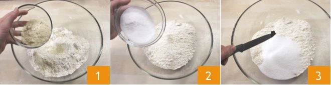 Para preparar os biscoitinhos de Natal com amêndoas, coloque em uma tigela grande a farinha de trigo, a farinha de amêndoas, 1 o açúcar refinado 2, as sementes da fava de baunilha 3,