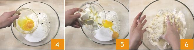 as gemas 4 e a manteiga amolecida em cubos 5. Comece a misturar todos os ingredientes com as mãos 6,