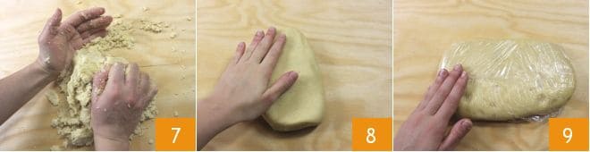 em seguida, transfira a mistura para uma superfície levemente enfarinhada e continue amassando 7 até obter uma massa homogênea e compacta 8. Forme uma bola, cubra com filme plástico e coloque na geladeira para descansar por pelo menos uma hora 9.