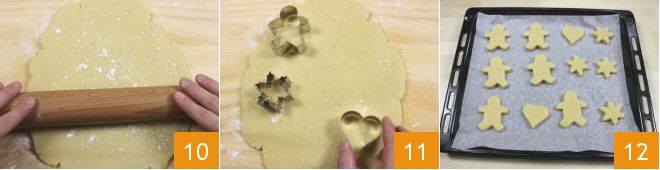 Após o tempo indicado, polvilhe com um pouco de farinha uma superfície de trabalho ou uma bancada e estenda a massa com um rolo até obter uma folha com espessura de 0,5 cm 10 e, usando cortadores natalinos, corte 40 biscoitos 11. Coloque-os em uma assadeira forrada com papel manteiga e asse em forno estático pré-aquecido, a 180ºC por cerca de 6 minutos (a superfície deve permanecer clara) 12.