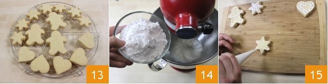 Deixe os biscoitos esfriarem completamente sobre uma grade 13 e, enquanto isso, prepare a cobertura: bata a clara em neve e misture aos poucos o açúcar de confeiteiro até obter uma mistura densa e homogênea 14, que você transferirá para um saco de confeitar com bico fino e liso. Decore cada biscoito como preferir 15 e deixe descansar por cerca de 5 minutos para que a cobertura endureça. Os biscoitinhos de Natal com amêndoas estão prontos: Feliz Natal!