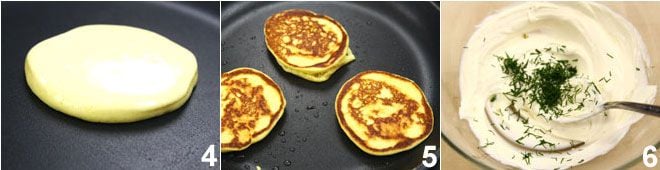 Aqueça e unte com um pouco de manteiga uma pequena frigideira antiaderente para crepes, quando estiver bem quente coloque uma concha de massa que se expandirá formando uma panqueca de cerca de 7 cm de diâmetro 4. Quando o fundo estiver firme, vire o blini com a ajuda de uma espátula e deixe dourar o outro lado também 5. Continue assim até terminar toda a massa. Comece a preparar a guarnição para os blinis: em uma tigelinha misture o creme azedo para deixá-lo cremoso e adicione o endro picado (reservando um pouco para decorar), sal e pimenta 6.