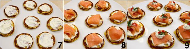 Espalhe o creme azedo sobre os blinis 7, coloque uma fatia de salmão defumado 8 e guarneça com mais um pouco de creme azedo, endro e algumas ovas de peixe vermelho 9. Os blinis estão prontos para serem saboreados como uma excelente entrada!