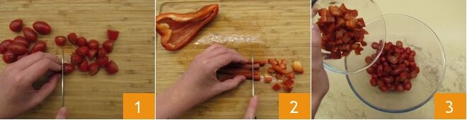 Para preparar o Gazpacho Bloody Mary, comece lavando e secando os tomatinhos e pimentões. Em seguida, corte os tomates ao meio 1 e os pimentões limpos em cubos 2. Junte-os em uma tigela 3