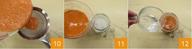 Obtenha um purê granuloso que você poderá coar com uma peneira colocada em uma tigela 10. Transfira o creme liso para os copos preenchidos em 2/3 com gelo 11. Em seguida, adicione 30 g de vodka por copo, misture bem 12.
