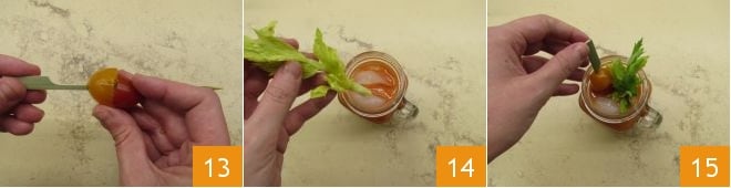 Passe para a decoração. Corte ao meio os tomatinhos vermelhos e amarelos e una metade de um com metade de outro espetando-os com um palito, fazendo-os parecer um tomatinho bicolor 13. Decore então o seu Gazpacho Bloody Mary primeiro com a rama de aipo 14 e depois com o palito de tomatinhos, mais uma pitada de pimenta e então beba imediatamente 15!