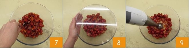 e misture bem 7. Cubra com uma folha de filme plástico e deixe marinar na geladeira por cerca de uma hora 8. Após esse tempo, bata tudo com um mixer de imersão 9.