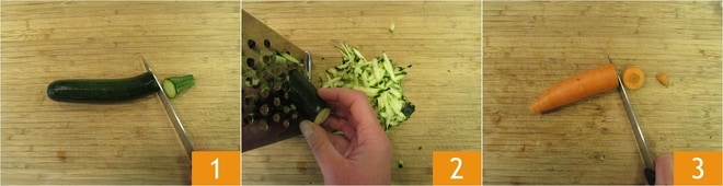 Para preparar os bolinhos de legumes crocantes, a primeira coisa a fazer é lavar bem a abobrinha e a cenoura. Remova as extremidades da abobrinha 1 e rale-a com um ralador de buracos grandes 2. Faça o mesmo com a cenoura, primeiro corte as pontas 3.
