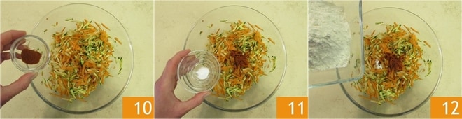 Em uma tigela, coloque as abobrinhas 7, as cenouras e as batatas 8. Misture bem tudo 9.