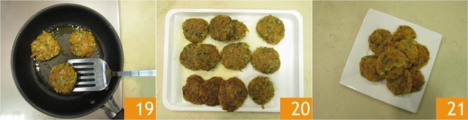 Forme bolas com a massa e achate-as levemente com as mãos 16, no total serão 12. Coloque o óleo em uma frigideira antiaderente 17 e, quando estiver quente, coloque os bolinhos dentro 18. Se a frigideira não for grande o suficiente, não coloque muitos de uma vez e cozinhe-os em várias etapas.