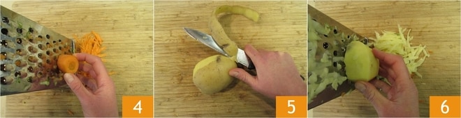 Depois, rale-a 4. Descasque a batata 5 e rale-a 6.