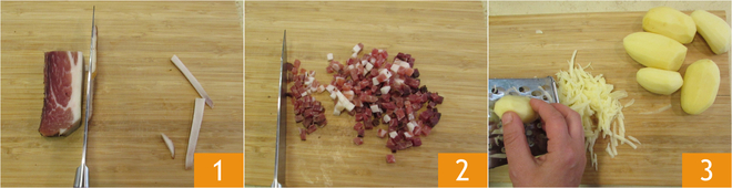 Para preparar os bolinhos de batata e speck, retire a pele 1 do speck e corte em cubinhos 2. Descasque as batatas e rale-as com um ralador de buracos grandes 3.