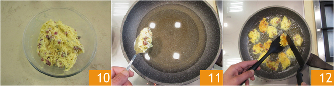 Misture para integrar tudo 10. Agora coloque o óleo de sementes em uma panela e aqueça até uma temperatura de 160°-170°, depois use 2 colheres para formar os bolinhos 11. Frite por alguns minutos, pressionando levemente, depois vire-os e deixe dourar o outro lado 12.