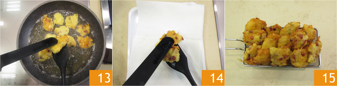 À medida que estiverem prontos, escorra-os 13 em uma bandeja forrada com papel toalha 14. Saboreie os bolinhos de batata e speck logo que estiverem prontos 15!