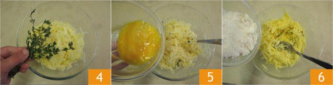 Em uma tigela, coloque as batatas, as folhas de tomilho 4, os ovos 5 e misture. Depois adicione o Parmigiano Reggiano DOP 6.
