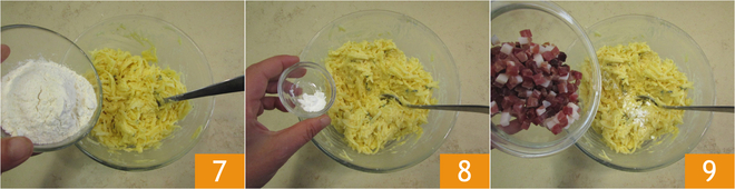 Incorpore também a farinha 7 e o fermento 8. Por último, adicione o speck 9, sal e pimenta.