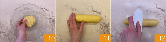 Deixe a massa descansar por 10 minutos na geladeira coberta com um pano 10. Retome a massa, forme um cilindro 11 e divida-o ao meio com uma espátula 12.<\/p>