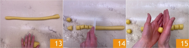 Crie dois rolinhos longos 13 e corte-os em pedaços obtendo cerca de 24 unidades 14. Forme bolinhas passando-as rapidamente entre as mãos 15. <\/p>