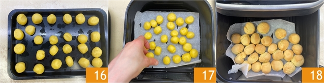 Depois de prontas todas as bolinhas 16, passe para a cozedura: coloque uma folha de papel manteiga perfurado na cesta da fritadeira, disponha as bolinhas 17 e cozinhe na fritadeira sem óleo a 180°C por 8 minutos, virando-as na metade do tempo. Devem ficar levemente douradas 18. <\/p>