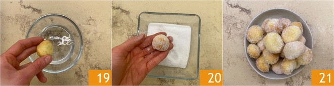 Uma vez prontas, mergulhe-as rapidamente na água 19 e depois no açúcar 20: assim, mesmo que não estejam oleosas como na fritura clássica, o açúcar grudará facilmente. Seus bolinhos de chuva na fritadeira sem óleo estão prontos para serem degustados 21.<\/p>